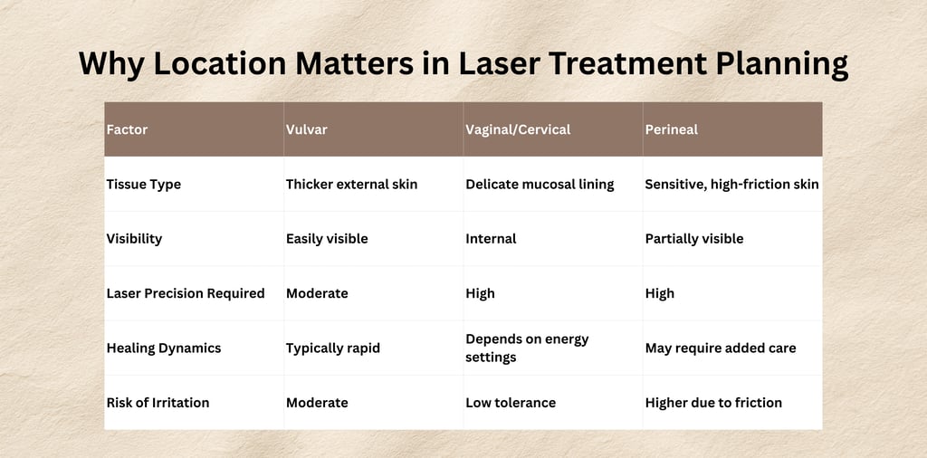 Genital warts are treatable, but their location determines the safest and most effective treatment pathway. Vulvar, vaginal/cervical, and perineal lesions each require tailored laser settings, technique, and aftercare.