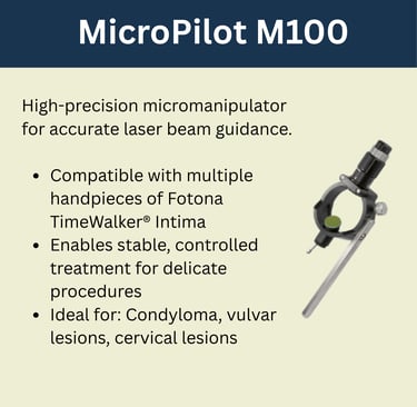 Although the MicroPilot M100 is specifically optimized for vulvar and cervical applications, advanced laser systems across the TimeWalker® II platform can be adapted for perineal treatments with appropriate technique and parameter selection.